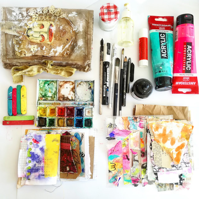2. Grab one or two very simple and junk journals If I use a brand new journal, with white untouched fancy paper I feel blocked. I cannot create easily at home so worse is when I'm on the go. So I grab small little journalswith painted pages, that I know that they will inspire me to create and that I will not be sorry if I mess up on them. Think on your on the go journal as a visual inspiration keeper rather than a book where you will create great art pieces. The mindset of creating big beautiful things can itself block creativity. Also prepare some awesome scrap papers that inspire you to start. I create a kind of a flowishjournal that helps me have on hand a stack of paper that I love